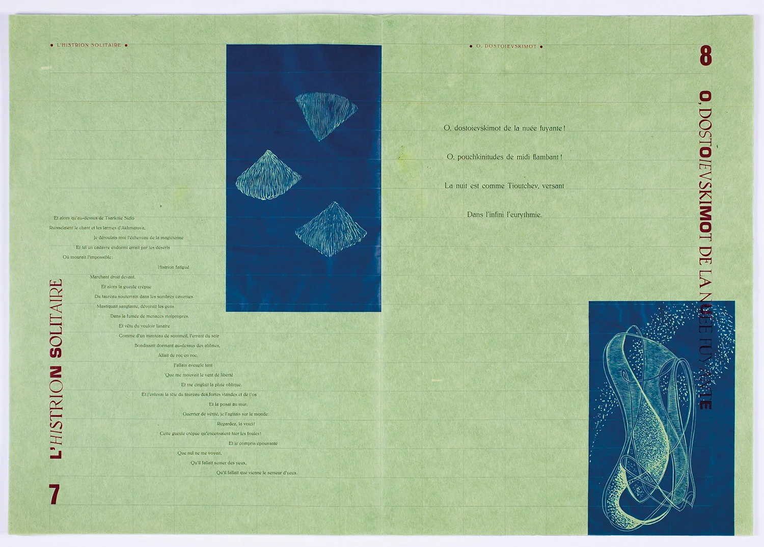 Des textes inédits de Khlebnikov dans des compositions typographiques et mises en page recherchées, imprimées dans deux formats, sur cinq papiers différents. Dans les deux tirages de tête sur papier Bunkoshi crème et papier Japon vert jade, est imprimé le gabarit de l’ouvrage, laissant voir la structure du livre, décrite avec des traits très fins imprimés en argent, et le divisant en dix-huit parts, clin d’œil à la notion de l’intégration architectonique cher aux modernistes russes. Ce livre-manifeste a été réalisé avec divers caractères de la fonderie Nebiolo à Turin, en plusieurs tailles, dans des dessins superbes des deux plus grands créateurs italiens de caractères modernes : Alessandro Butti et Aldo Novarese. Douze gravures abstraites sur carte varioklisch au burin par Michael Caine tirées dans des teintes arcanes, en dégradées irisées, inspirés par des kilims arméniens.